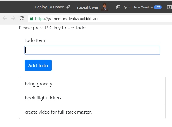 In above code also you notice when click on Add More Todo button we are replacing the container HTM with Add Todo Form without even properly destroying the old todo form. Therefore old todo form is still having click event handler which is connected with window object in JavaScript world. Hence Garbage collector can not clean up it and we start creating a memory allocation which never going to be clean up. The more todo we add the more memory allocations we create and our website will become sluggish and slow. Hence we created a memory leaking website.